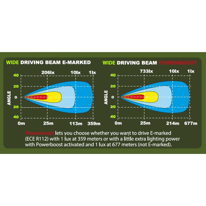 - Light beam range: 1 lux @ 359 m (ECE mode), 773 m (Powerboost)