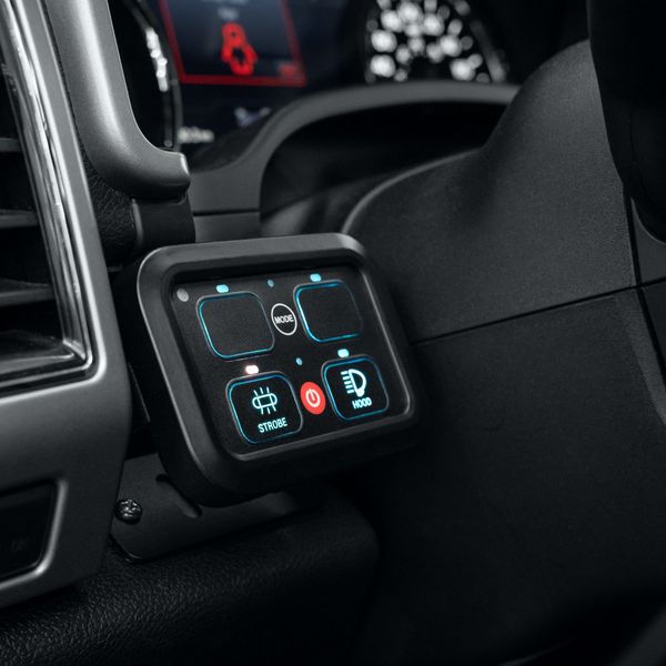 Versatile control panel with RGB backlighting for controlling four devices from one place. Ideal for work machines, trucks, and SUVs.